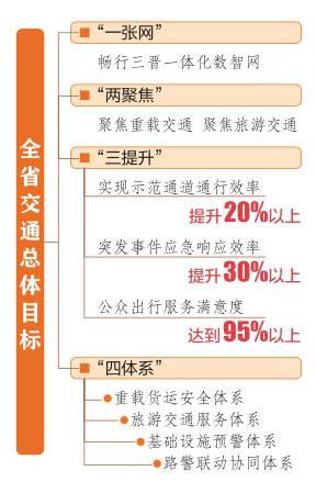 其中,“一张网”指搭建一张畅行三晋一体化数智网。“两聚焦”是重点聚焦重载交通、旅游交通。“三提升”是实现示范通道通行效率提升20%以上,突发事件应急响应效率提升30%以上,公众出行服务满意度达到95%以上。“四体系”则是形成重载货运安全体系、旅游交通服务体系、基础设施预警体系和路警联动协同体系。(任志霞)